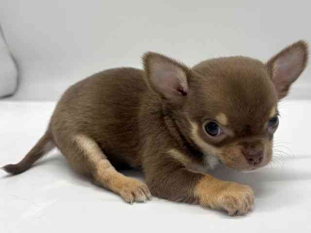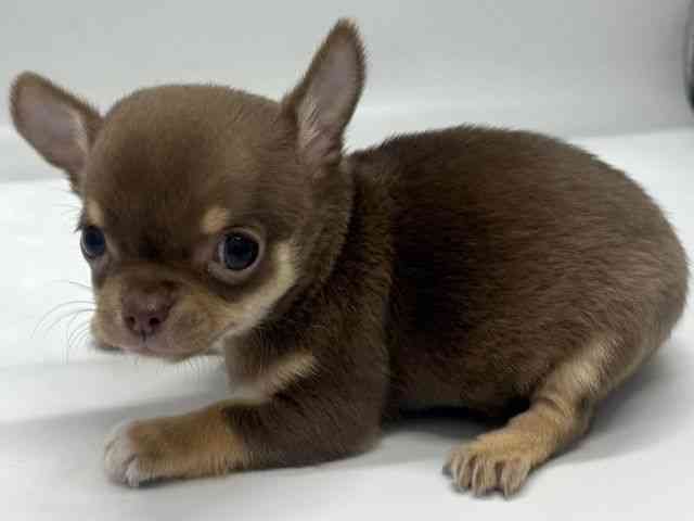 【父:ブラック&タン 2kg  母:チョコレート&タン 2.3kg】 チョコレートカラーのスムースチワワちゃんが来てくれました!! ちょっとビビりさんな所もありますが、慣れてきたらとっても甘えん坊さんになります(*'▽')