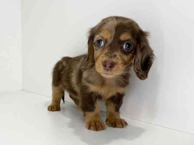 人気なチョコレートダップルのダックスちゃんがやって来てくれました♪ ちょっぴり控えめな甘えん坊さんです(#^^#) 父:シルバーダップル 3.8kg 母:ブラック&タン 3.5kg