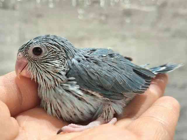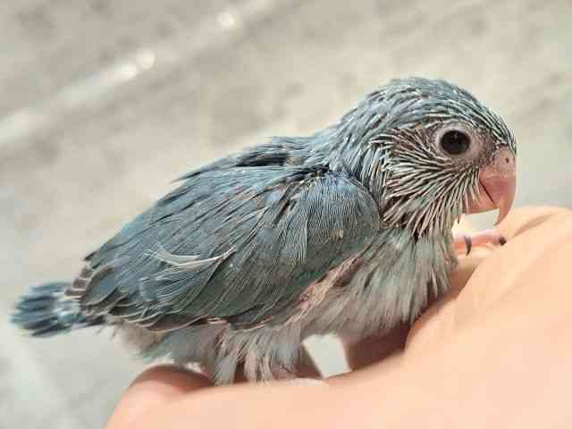 ブルーカラーのマメルリハのヒナです! つぶらな瞳が可愛いです! ごはんをもりもり食べてくれてます!! ※おそらく女の子。 ※3月29日以降お迎えしていただけます。