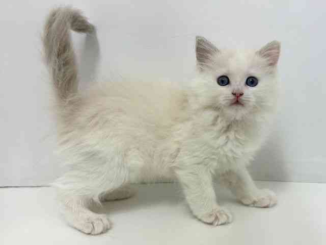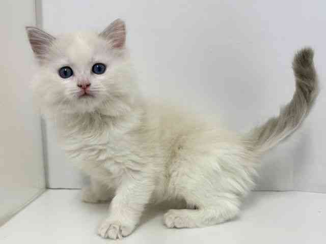 父: 4.4kg 母:ブルーポイントバイカラー 3.7kg まっしろ!?な毛色が神々しいラグちゃん! よく見るとハチワレです☆ 抱っこ大好きな甘えたさんです♪